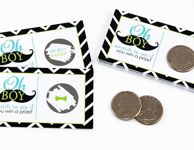 Mustache them scratch and win tickets are a fun game to keep your guests entertained at the baby shower or function you are hosting. Modern navy chevron with bright aqua and lime accents. Scratch and win cards: Pint sized card 2" x 3.5". Premium uv coated finish. Choose your winners. Ready to play, losers packed separate from winners. No fuss on printing and cutting these adorable party games. Just open and set at each table.