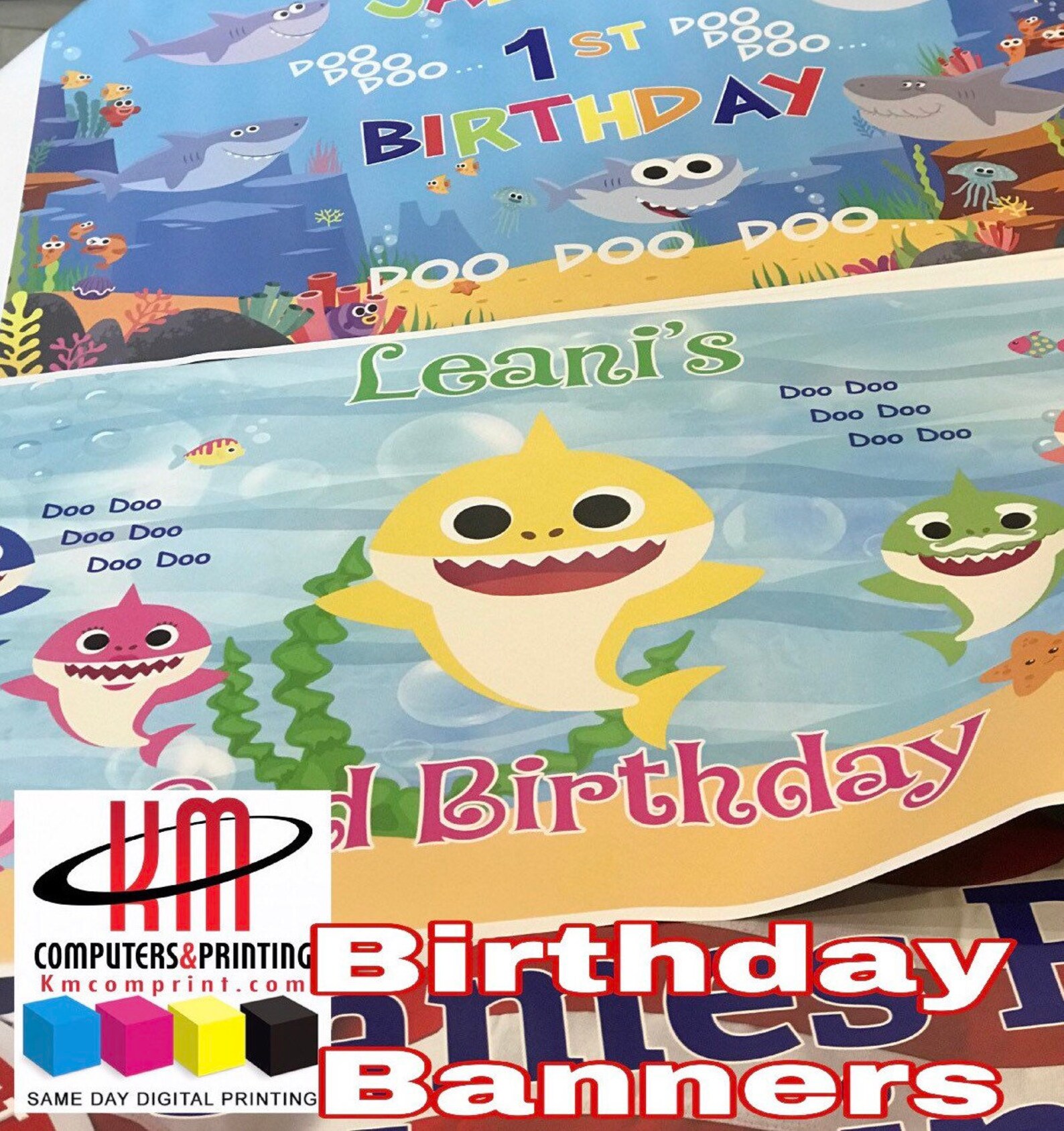 3x5 foot Baby Shark birthday banner sign printed on glossy photo paper.